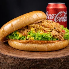 Pão macio e dourado recheado com strogonoff de frango cremoso e bem temperado, coberto com mussarela derretida e ovo, criando uma combinação extremamente saborosa. Tudo isso com milho, tomate fresco, alface crocante e nossos molhos especiais. E para fechar o combo perfeito: uma Coca-Cola lata bem gelada.